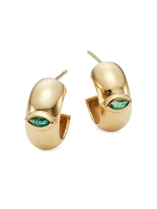 These wide huggie hoops are cast in 14K gold with glistening bezel-set marquise-cut emeralds.