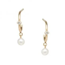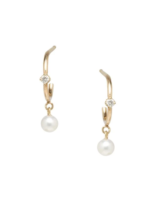 Delicate gold huggie earrings featuring dazzling prong-set diamonds in the hoop and finished with a 2mm pearl dangling from the bottom.