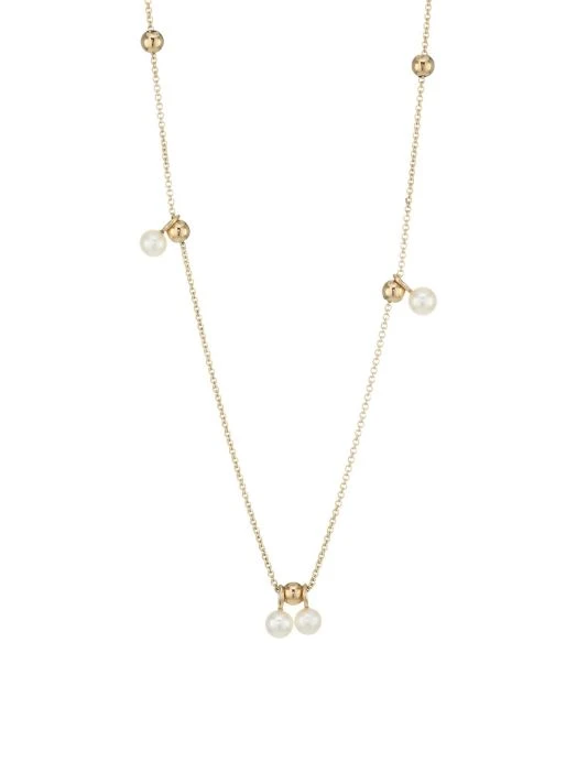 Dainty 14K yellow gold chain set with white freshwater pearl pendants.
