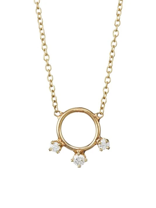 Delicate 14K yellow gold cable chain suspends a circular pendant accented with three prong-set diamonds.