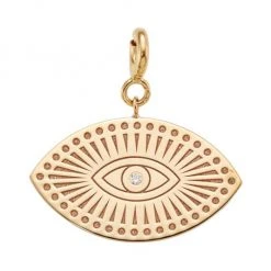 From the Charmed Collection. Accented with a petite round white diamond and engraved details, this 14K yellow gold evil eye charm showcases a spring ring clasp ideal for clipping onto Zoë Chicco’s small or medium oval-link chains or small paperclip chains.