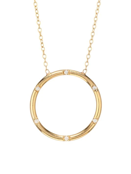 A gleaming gold circle set with six French bead-set white diamonds sparkles on a cable-link chain.