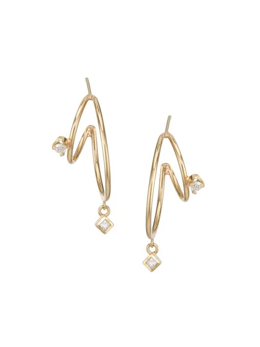 An modern hoop design in 14K yellow gold with a dangling bezel-set princess diamond and a prong-set round diamond.