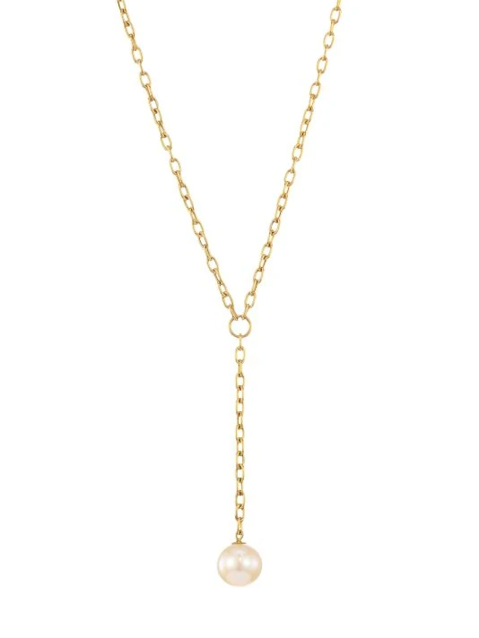 Fine square-oval link lariat necklace in 14K yellow gold with a elicate cultured pearl.