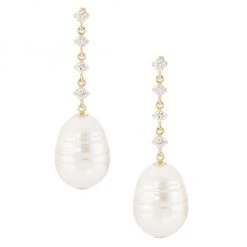 From the Pearls Collection. Handcrafted of 14K yellow gold, Zoë Chicco’s drop earrings are embellished with luminous white freshwater baroque pearls and sparkling round white diamonds.