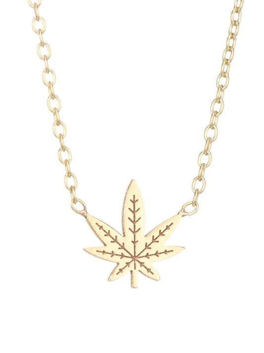 A delicate gold chain frames a playful “mary jane leaf” pendant.