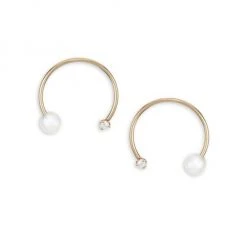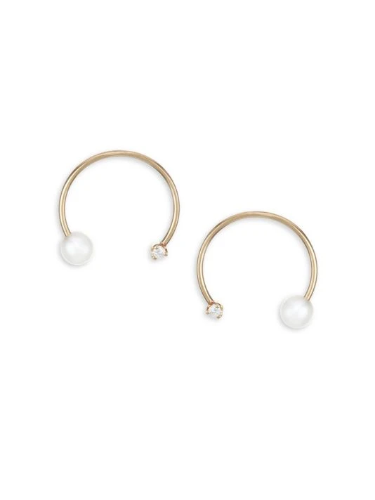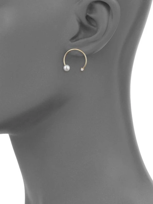 Modern open circle 14K yellow gold studs finished with white pearl and diamond accents.