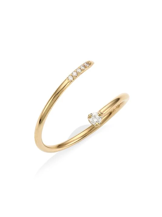Modern open bypass ring with a prong set 5pt diamond on one side and 5 French pave set daimonds on the other.