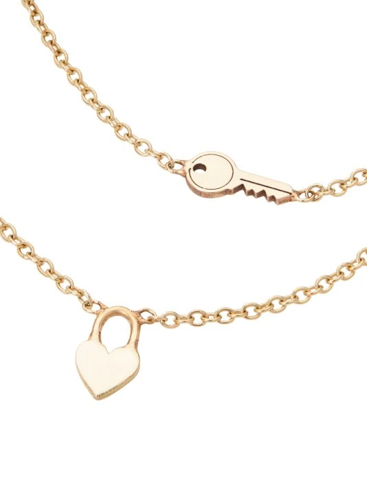 From the Itty Bitty Symbols Collection. Zoë Chicco’s 14K-yellow-gold necklace features a petite heart padlock pendant and key fixed to a fine cable chain. Handcrafted in Los Angeles, this dainty accessory captures the designer’s playful aesthetic.