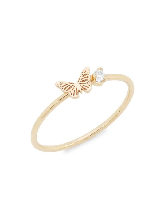 From the Itty Bitty Symbols Collection. Zoë Chicco’s dainty 14K-yellow-gold ring is detailed with a butterfly topper and a single prong diamond.
