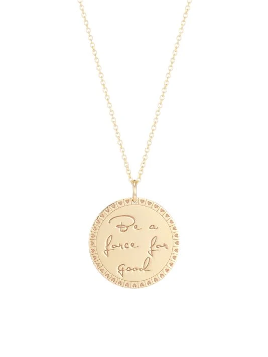 From the Mantra Collection. Made of 14K yellow gold, this necklace features a round medallion pendant engraved with ‘Be a Force for Good’ lettering and a border of petite hearts.