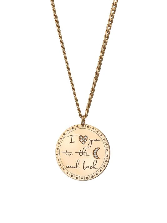 From the Mantras Collection. A star bordered “I Love You To The Moon And Back” pendant with diamond pavé heart and moon suspends from a gleaming curb link chain crafted from 14K yellow gold.