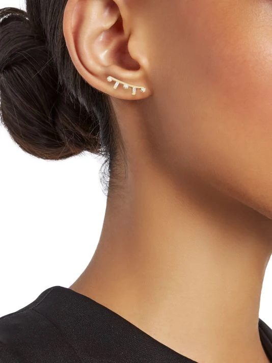 From the Paris Collection. A row of baguette and round-cut diamonds dance across this curved bar ear shield.