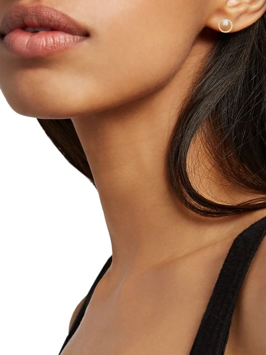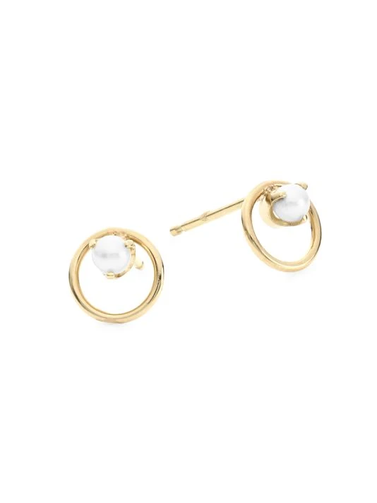 Delicate open circle studs gleam in 14K gold with a prong-set pearl center.