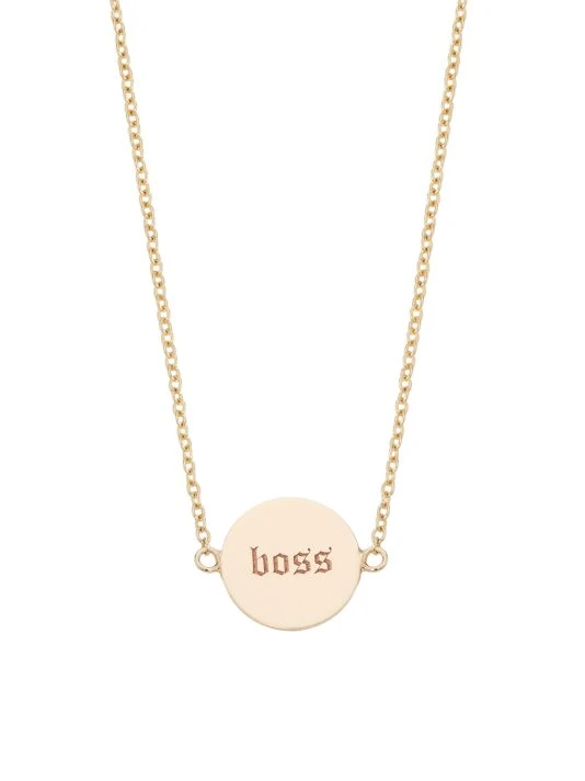 From the Tender Tokens Collection. Made of polished 14K yellow gold, Zoë Chicco’s necklace features a reversible disc pendant engraved with “Mama” lettering on one side and “Boss” on the other. This playful accessory is handcrafted by master artisans in the designer’s Los Angeles-based studio.